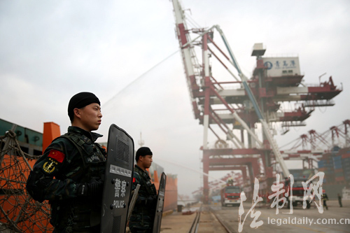 ????此次海上聯(lián)合反恐演練以阻止多名“涉恐分子”潛入港區(qū)及外輪企圖進(jìn)行恐怖活動(dòng)為背景,幾名“恐怖分子”駕車意圖混入油港區(qū)實(shí)施破壞,被識(shí)破后仍試圖強(qiáng)行進(jìn)入。與此同時(shí),前灣港集裝箱碼頭也發(fā)現(xiàn)幾名“涉恐分子”偽裝成船員,隨集裝箱貨輪進(jìn)入港區(qū)實(shí)施破壞行動(dòng),并在一艘即將離港的貨輪上劫持“人質(zhì)”,企圖逃離港區(qū)。面對(duì)如此復(fù)雜的局面,公安、邊檢、海關(guān)、國(guó)檢、港口等部門接到情報(bào)預(yù)警信息后,及時(shí)啟動(dòng)海上聯(lián)合反恐處突應(yīng)急預(yù)案,聯(lián)合反恐指揮部及時(shí)下達(dá)指令,參加演練單位立即行動(dòng),邊檢利劍突擊隊(duì)隊(duì)員迅速登輪控制“涉恐分子”,消防部門架設(shè)水槍撲滅引燃物品,海關(guān)、海事巡邏艇在集裝箱船舶周邊海域鋪設(shè)防油污圍欄,并收繳走私涉恐物資。成功處置險(xiǎn)情后,碼頭恢復(fù)生產(chǎn)作業(yè)。