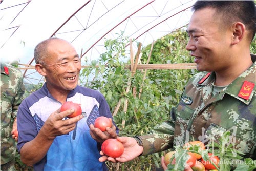 圖為當(dāng)?shù)剞r(nóng)民稱(chēng)贊官兵自己種植的西紅柿