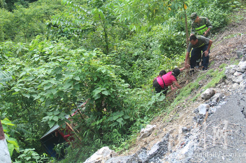????獲悉情況后,該所立即向百南鄉(xiāng)衛(wèi)生院通報(bào)情況,并組織官兵趕赴現(xiàn)場(chǎng)施救。邊防官兵在現(xiàn)場(chǎng)發(fā)現(xiàn)一輛三輪車(chē)側(cè)翻在半山坡,山坡下是10多米深的河流?!昂迷谟袠?shù)攔住,要不然后果不敢想象。”圍觀(guān)群眾李師傅說(shuō)道。