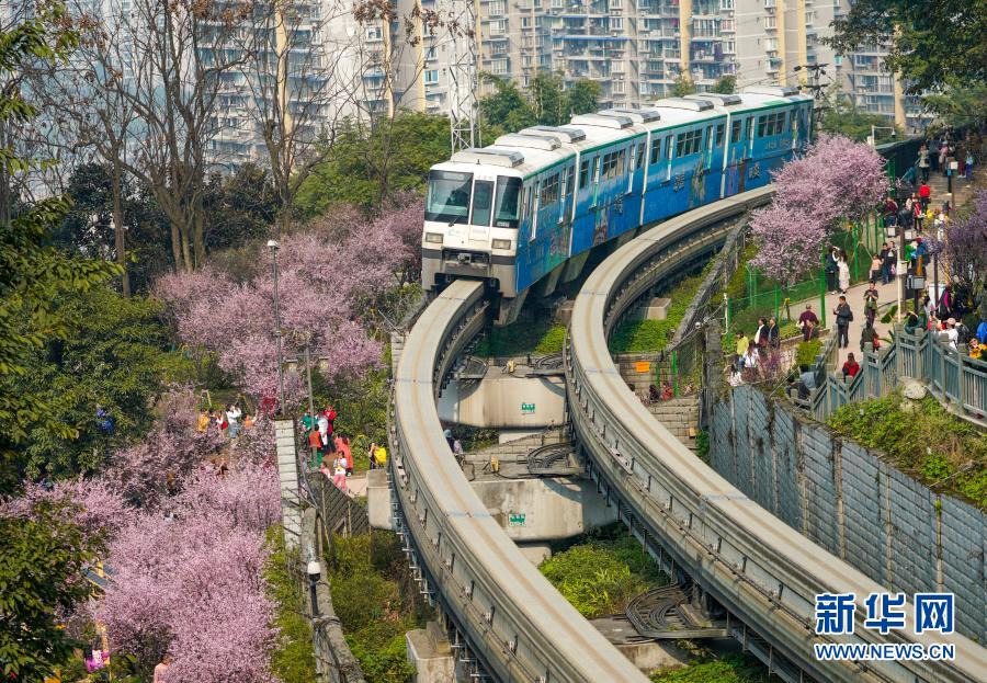 2月23日,在重慶軌道交通2號線佛圖關(guān)段,一列單軌列車穿越花海奔馳而過。