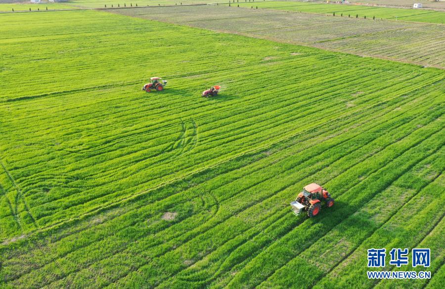 2月23日,湖州錢山下糧油專業(yè)合作社工作人員駕駛農(nóng)機(jī)在田間給小麥?zhǔn)┓剩o(wú)人機(jī)照片)。立春過后氣溫回升,浙江省湖州市吳興區(qū)道場(chǎng)鄉(xiāng)全力開展春耕工作。今年該鄉(xiāng)計(jì)劃播種農(nóng)作物總面積1.2萬(wàn)畝,其中水稻5000畝、小麥2000畝。新華社記者 翁忻旸 攝