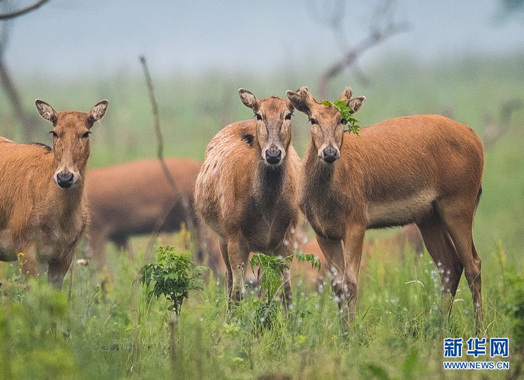 5月17日,一群麋鹿在石首麋鹿國家級自然保護區(qū)內活動。新華社記者 肖藝九 攝