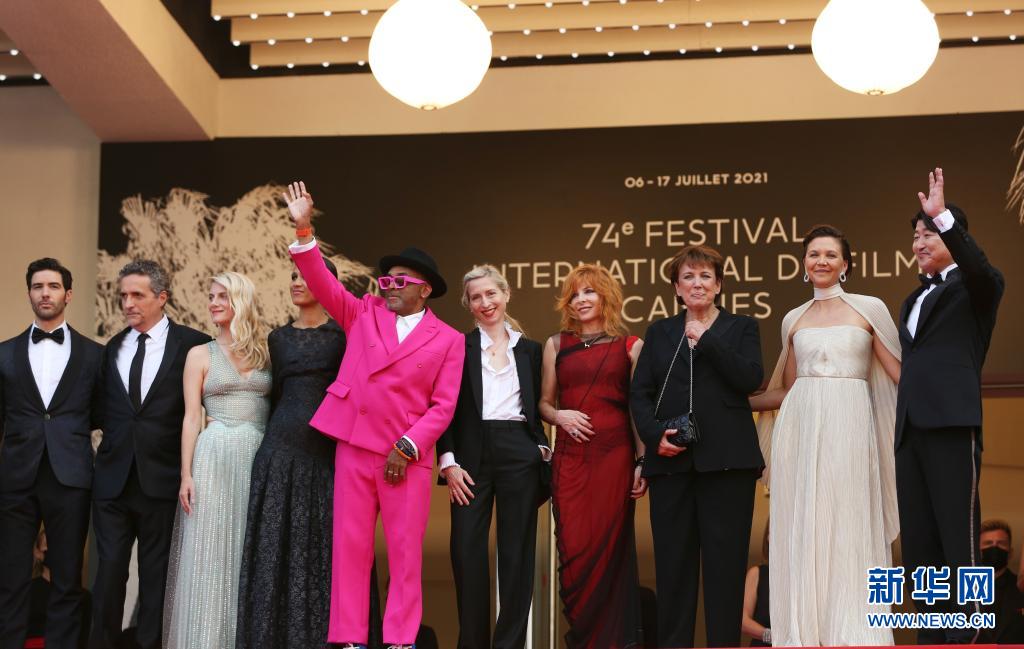 7月6日,第74屆法國戛納國際電影節(jié)主競賽單元評委會主席、美國導演和制片人斯派克·李(左五)攜主競賽單元評委出席開幕式紅毯。