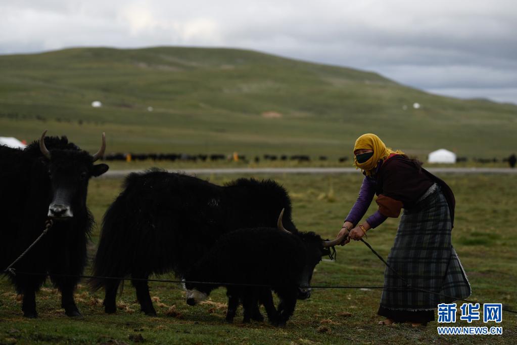 8月3日,在瑪沁縣當洛鄉(xiāng)貢龍村的夏季草場上,牧民在拴牦牛。