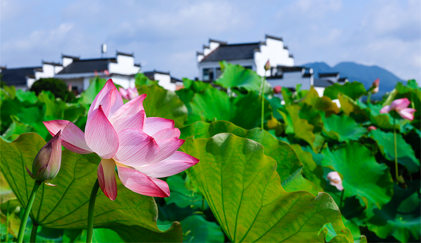仲夏时节,安徽省黄山市休宁县海阳镇盐铺村的荷塘里,朵朵荷花渐次绽放,随风摇曳,吸引众多游客和市民前来观赏打卡。