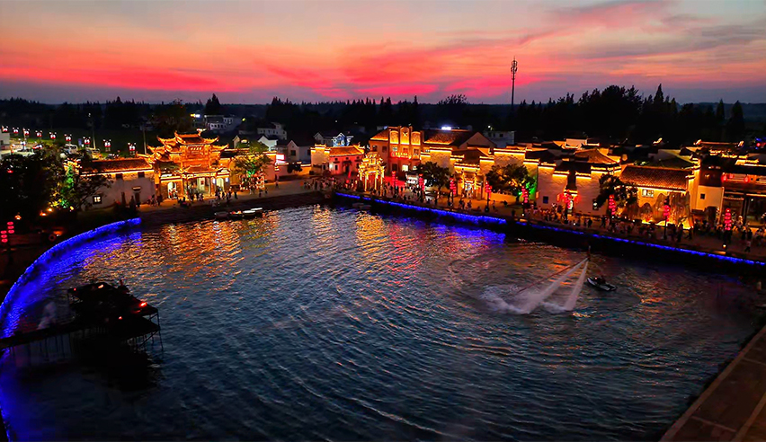 近日,在安徽铜陵犁桥水镇,传统非遗与现代科技结合的水上表演精彩纷呈,铁花飞溅、火壶腾空与晚霞相映,独木漂、高杆船技同灯影水色交融。游客赏水乡夜色,享乡村晚风清凉。