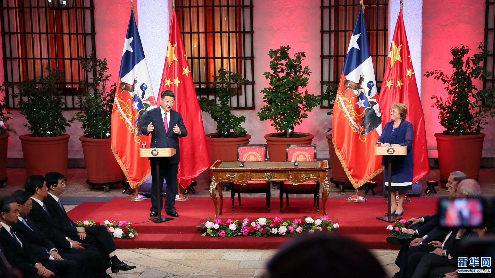11月22日,國家主席習(xí)近平在圣地亞哥同智利總統(tǒng)巴切萊特舉行會(huì)談。這是會(huì)談后,兩國元首共同會(huì)見記者。 新華社記者 蘭紅光 攝2016-11-23