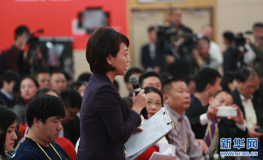 10月26日上午10:00,中國共產(chǎn)黨第十九次全國代表大會新聞發(fā)言人在梅地亞賓館二層新聞發(fā)布廳召開專題新聞發(fā)布會,請有關(guān)方面負(fù)責(zé)人解讀十九大報告,并回答記者關(guān)心的問題。圖為中央電視臺記者提問。新華網(wǎng) 翟子赫 攝