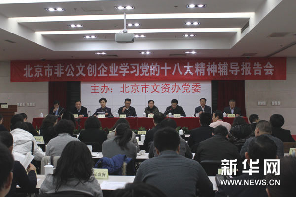 ??? 新華網(wǎng)北京11月28日電 (記者 陳元)27日,北京市國(guó)有文化資產(chǎn)監(jiān)督管理辦公室(簡(jiǎn)稱文資辦)召開非公有制文化創(chuàng)意企業(yè)學(xué)習(xí)宣傳黨的十八大精神輔導(dǎo)報(bào)告會(huì)。來(lái)自北京市的百余家非公文創(chuàng)企業(yè)代表參加了報(bào)告會(huì)。