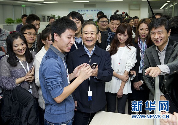 ??? 12月13日,國務(wù)院總理溫家寶到北京中關(guān)村考察并與部分企業(yè)負(fù)責(zé)人座談。這是溫家寶在百度公司考察時(shí),試用手機(jī)語音搜索。 新華社記者黃敬文 攝