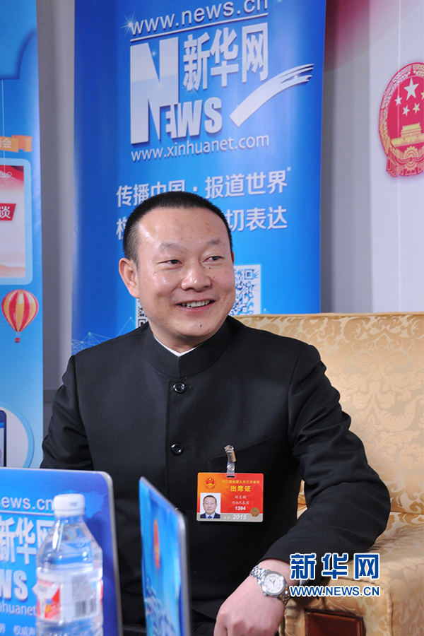 ??? 2015年3月12日,全國(guó)人大代表劉文新在人民大會(huì)堂新華網(wǎng)/中國(guó)政府網(wǎng)兩會(huì)訪談間接受記者專訪。新華網(wǎng)/中國(guó)政府網(wǎng)?李非 攝