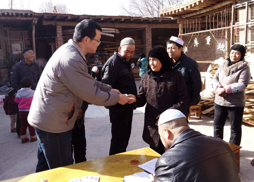 包毅為貧困戶發(fā)放慰問金,宣傳精準扶貧政策