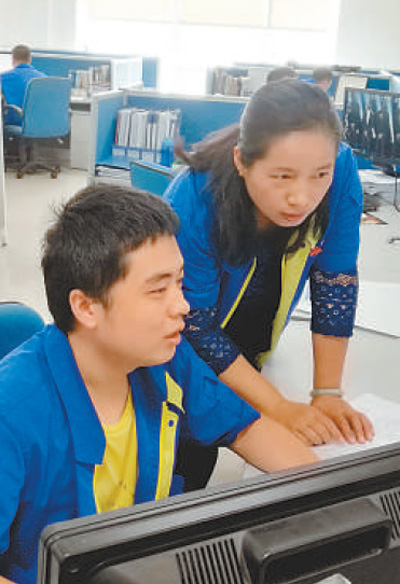 姜妍(右)在指導(dǎo)員工修改設(shè)計(jì)。本報(bào)記者 何 勇攝