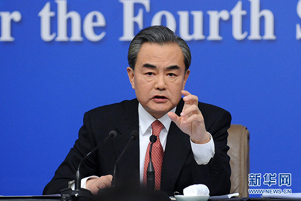 ????十二屆全國人大四次會議新聞中心于3月8日(星期二)10時在梅地亞中心多功能廳舉行記者會,邀請外交部部長王毅就“中國的外交政策和對外關(guān)系”的相關(guān)問題回答中外記者的提問。圖為外交部部長王毅回答記者提問。新華網(wǎng)/中國政府網(wǎng)記者 陳競超攝