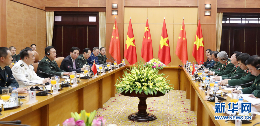 ??? 6月18日,在越南首都河內(nèi),正在越南訪問(wèn)的中央軍委副主席范長(zhǎng)龍(左三)與越南國(guó)防部長(zhǎng)吳春歷(右三)舉行會(huì)談。 新華社發(fā)(李曉偉攝)