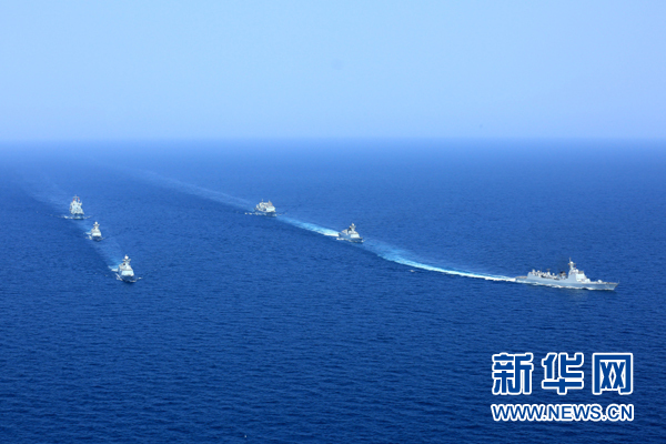 圓滿完成亞丁灣、索馬里海域護(hù)航任務(wù)的中國海軍第二十批護(hù)航編隊(duì)(右)與第二十一批護(hù)航編隊(duì)分航,駛離亞丁灣海域開始執(zhí)行環(huán)球訪問任務(wù)(2015年8月23日攝)。新華社發(fā)(曾濤 攝)
