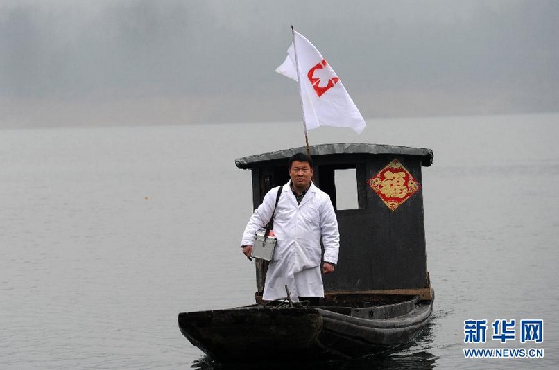 海島的東島岸邊,常年??恐粋€船屋,外面掛著“麻埠鎮(zhèn)齊山村海島衛(wèi)生站”的牌子。39歲的余家軍是船屋的主人,1999年衛(wèi)校畢業(yè)后回到齊山村,和妻子吳起嬌把家安到了船上,取名“海島衛(wèi)生站”,他也成了這里唯一的村醫(yī)。18年里,不論是白天黑夜、刮風下雨甚至下雪,余家軍都劃著一條小木船,每日來往于東西兩島之間,為200多名村民看病,這條木船也被村民們親切地稱為“水上120”。