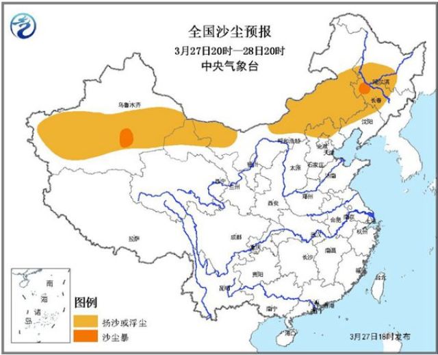 中央氣象臺3月27日18時繼續(xù)發(fā)布沙塵暴藍(lán)色預(yù)警: