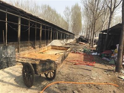 大院除了破敗的大棚,沒有任何養(yǎng)殖設(shè)施。新京報記者現(xiàn)場看到,一名養(yǎng)殖戶把清理出的糞便和污水裝進小推車,然后倒進院后的一條水溝里。