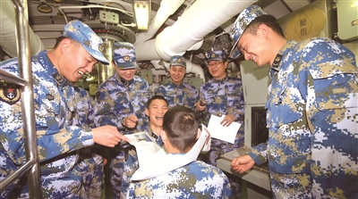 某潛艇支隊(duì)立足“百人同操一桿槍的現(xiàn)實(shí)”,堅(jiān)持踐行群眾路線、密切聯(lián)系官兵。圖為該支隊(duì)某艇員隊(duì)副政委徐建鵬和戰(zhàn)士們一起開展“龍宮游戲”,以緩解深海長(zhǎng)航帶來的巨大心理壓力,為艇員們保持良好備戰(zhàn)狀態(tài)增添動(dòng)力。茆 琳攝