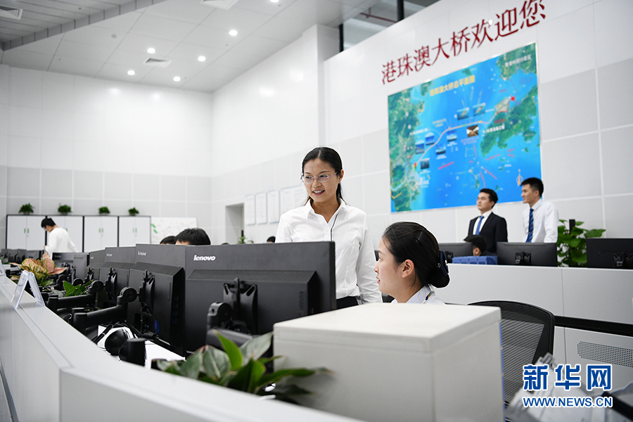 港珠澳大橋管理局營(yíng)運(yùn)管理部部長(zhǎng)江曉霞(中間站立者)在調(diào)度中心查看大橋車(chē)輛通行情況(10月24日攝)。新華社記者梁旭攝