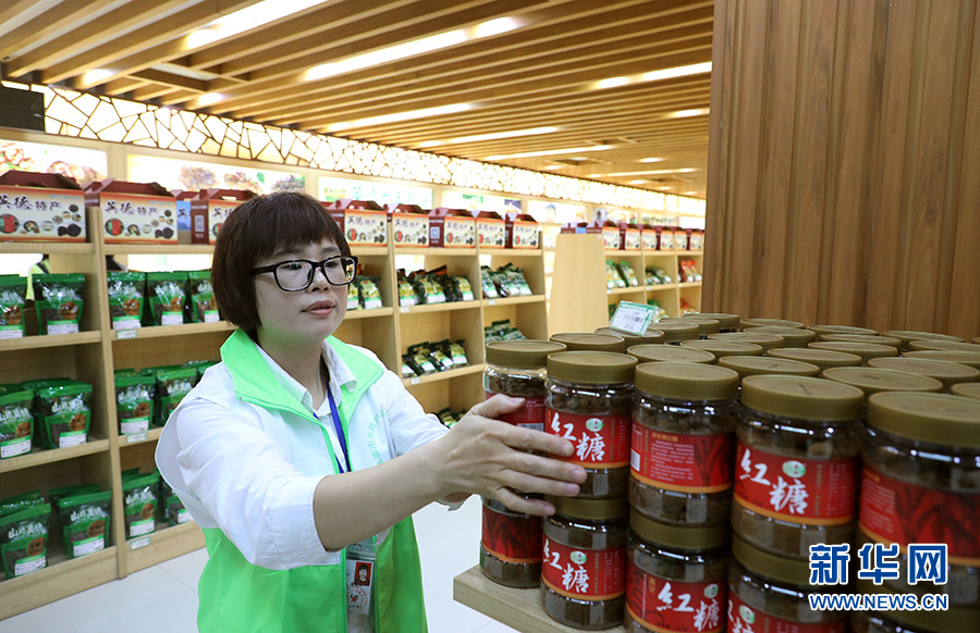 在英德市電子商務(wù)產(chǎn)業(yè)園,農(nóng)特產(chǎn)品o2o體驗(yàn)館的工作人員將本地電商企業(yè)生產(chǎn)的紅糖商品上架展銷(xiāo)(10月24日攝)。新華社記者王瑞平攝