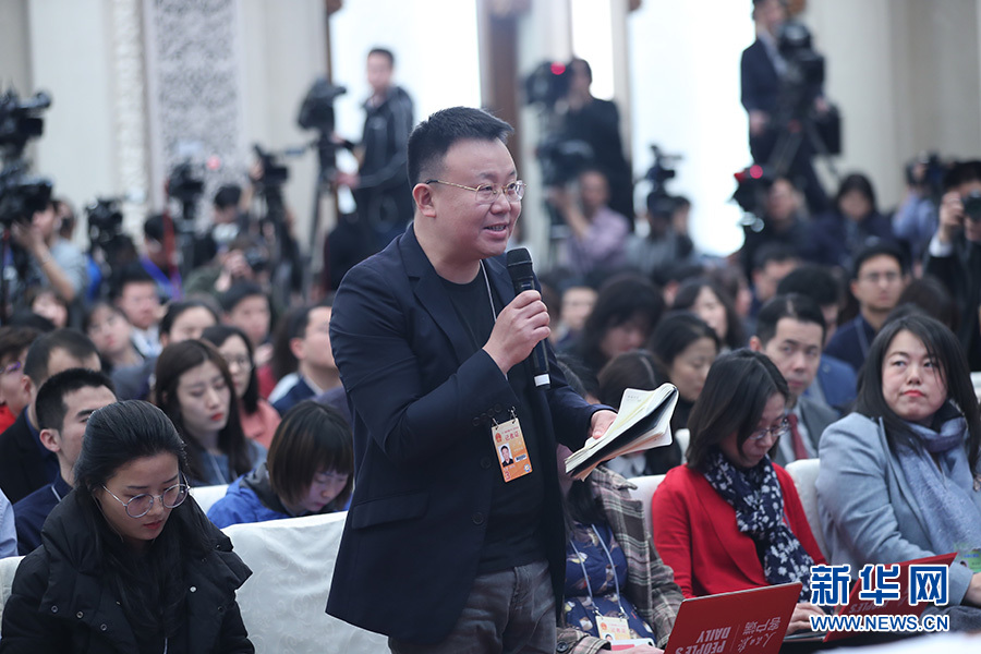 十三屆全國(guó)人大二次會(huì)議3月4日上午11時(shí)15分在人民大會(huì)堂新聞發(fā)布廳舉行新聞發(fā)布會(huì),由大會(huì)發(fā)言人就大會(huì)議程和人大工作相關(guān)的問(wèn)題回答中外記者提問(wèn)。圖為封面新聞?dòng)浾咛釂?wèn)。新華網(wǎng)/中國(guó)政府網(wǎng) 陳杰 攝