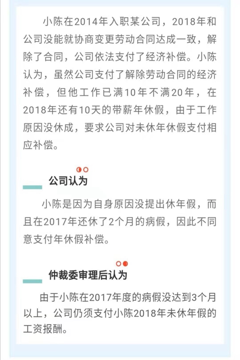 未休年假能要求經濟補償嗎?人社部官方微信2日發(fā)布案例,小陳2018年和公司解除了合同,公司依法支付了經濟補償。小陳認為,他工作已滿10年不滿20年,在2018年還有10天的帶薪年休假,由于工作原因沒休成,要求公司對未休年休假支付相應補償。此訴求最終獲得仲裁委支持。(李金磊)