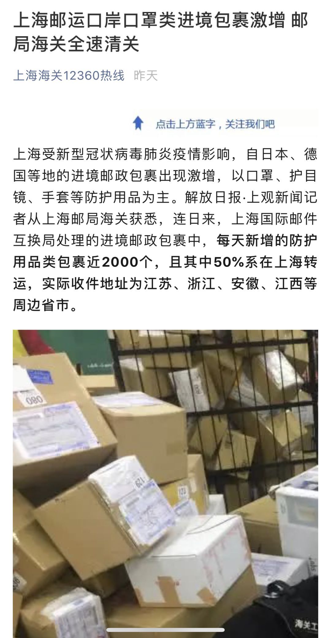 海關(guān)總署1月27日發(fā)出通知,對聲明涉及疫情物資的郵件快件,可以采取個案處理方式,優(yōu)先辦理報關(guān)手續(xù)。為加速進出境郵件中口罩、護目鏡、手套等肺炎疫情防護用品的清關(guān)速度,上海郵局海關(guān)對外公布春節(jié)期間24小時聯(lián)系電話:021-56355716。相關(guān)防護用品郵件的寄收件人如有需求,可致電詳細(xì)報告郵件號碼,海關(guān)將即時進行快速驗放。