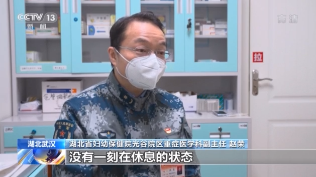 湖北省婦幼保健院光谷院區(qū)重癥醫(yī)學(xué)科副主任 趙榮:他隨時都有可能處在一種搶救狀態(tài),一個班4個醫(yī)生6個護士,甚至要6個護士進(jìn)紅區(qū),大家從進(jìn)來到出去沒有一刻在休息。