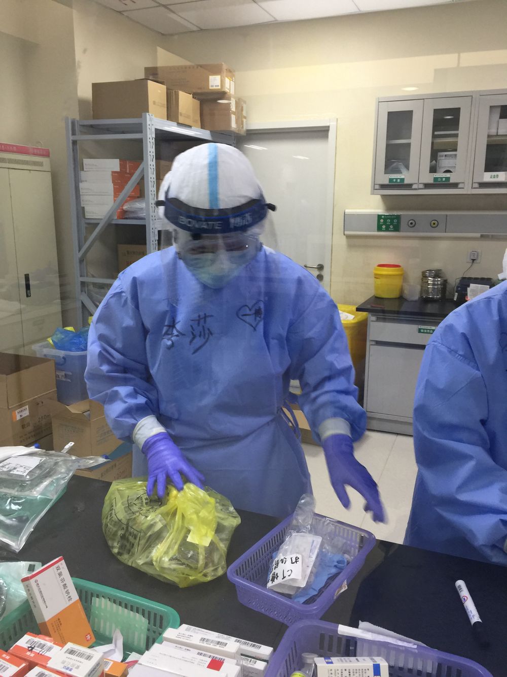 我想了想,有點開玩笑地說:“家人現(xiàn)在都很平安,唯一的心愿是可以見到我最喜歡的偶像王一博。”然后同事們就起哄說要錄下來,并在我的防護服上寫了四個大字“一博等我”。