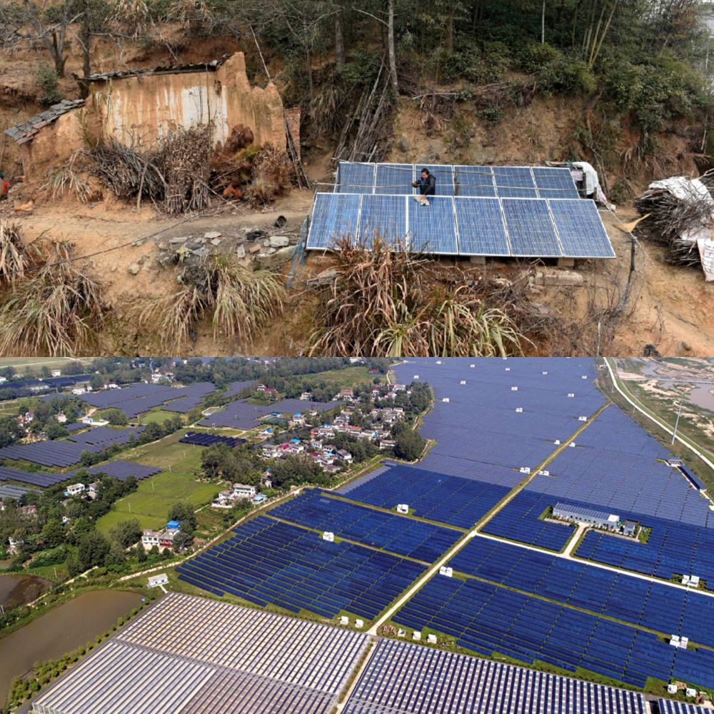 (上圖:2015年1月28日,金寨縣全軍鄉(xiāng)沙河店村村民在擦拭自家后院的光伏發(fā)電板,新華社記者劉軍喜攝;下圖:2017年9月14日,金寨縣小南京光伏農(nóng)業(yè)生態(tài)園全景。新華社記者陶明攝)