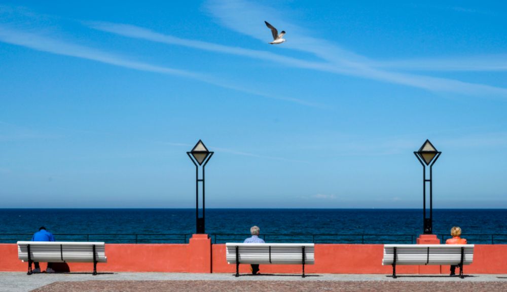 5月21日,在德國(guó)賓茨,人們坐在海邊的長(zhǎng)椅上。歐洲地區(qū)新冠疫情持續(xù)緩解,多國(guó)已重新開放或計(jì)劃開放邊界,為即將到來(lái)的夏季旅游旺季創(chuàng)造條件。新華社/法新