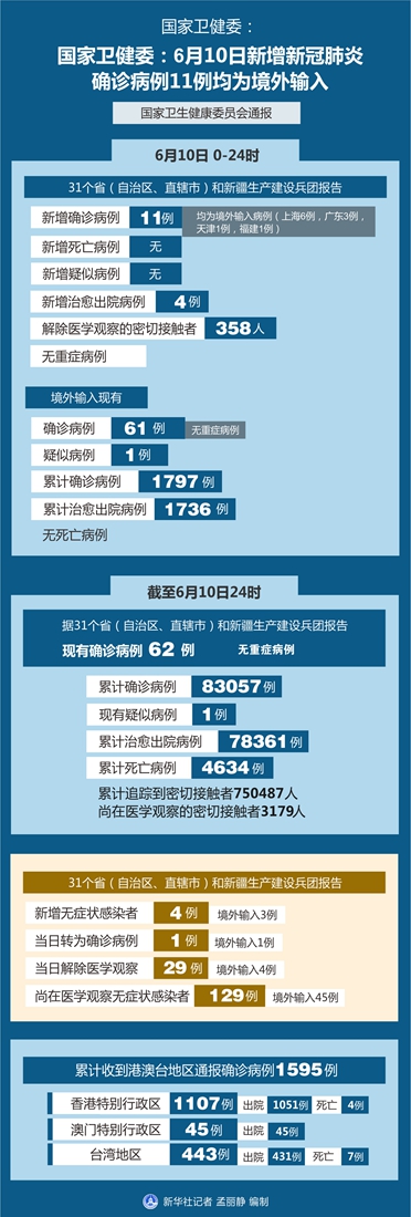 新華社北京6月11日電(記者陳聰)據(jù)國家衛(wèi)生健康委員會(huì)11日通報(bào),6月10日0-24時(shí),31個(gè)?。ㄗ灾螀^(qū)、直轄市)和新疆生產(chǎn)建設(shè)兵團(tuán)報(bào)告新增新冠肺炎確診病例11例,均為境外輸入病例(上海6例,廣東3例,天津1例,福建1例);無新增死亡病例;無新增疑似病例。