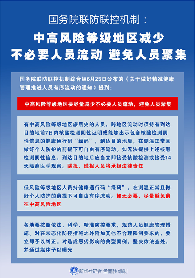 新華社北京6月25日電(記者王秉陽)國務(wù)院聯(lián)防聯(lián)控機(jī)制綜合組25日公布的《關(guān)于做好精準(zhǔn)健康管理推進(jìn)人員有序流動(dòng)的通知》提到,中高風(fēng)險(xiǎn)等級(jí)地區(qū)要盡量減少不必要人員流動(dòng),避免人員聚集。