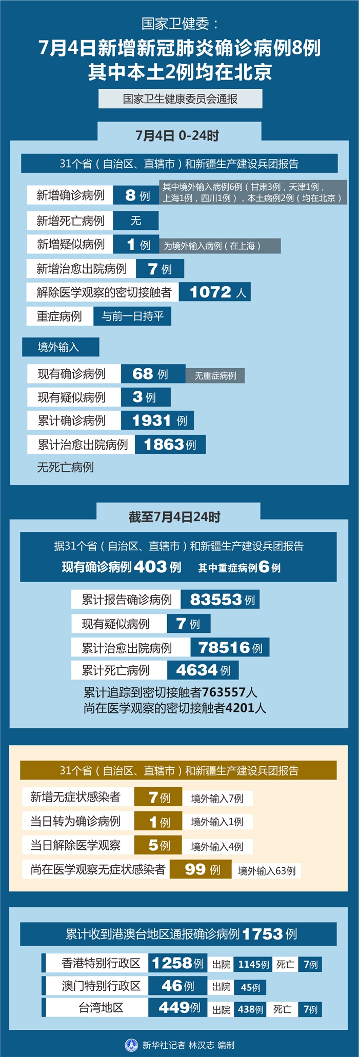 截至7月4日24時(shí),據(jù)31個(gè)?。ㄗ灾螀^(qū)、直轄市)和新疆生產(chǎn)建設(shè)兵團(tuán)報(bào)告,現(xiàn)有確診病例403例(其中重癥病例6例),累計(jì)治愈出院病例78516例,累計(jì)死亡病例4634例,累計(jì)報(bào)告確診病例83553例,現(xiàn)有疑似病例7例。累計(jì)追蹤到密切接觸者763557人,尚在醫(yī)學(xué)觀察的密切接觸者4201人。