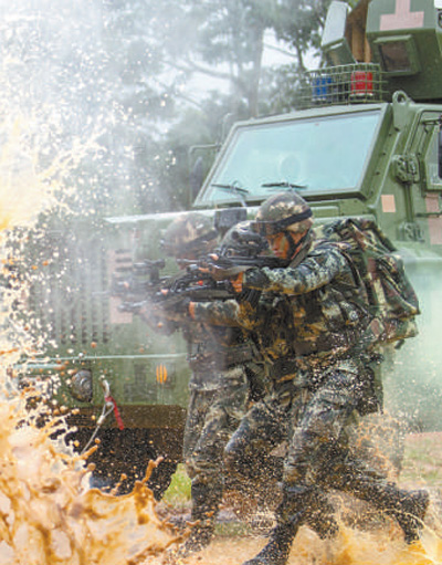中隊(duì)官兵扛著彈藥箱在泥水中訓(xùn)練沖刺。記者 金 歆攝