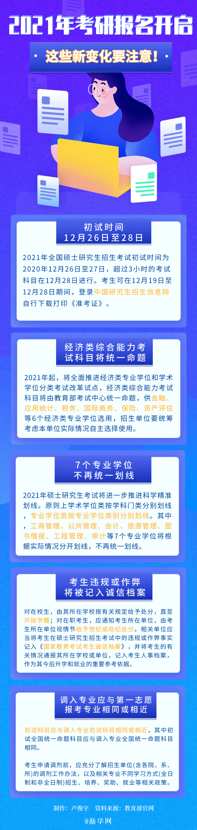 ??? 10月10日起至10月31日,全國碩士研究生招生考試開始正式報(bào)名,每天9:00-22:00,考生可登錄網(wǎng)上報(bào)名平臺(tái)填報(bào)報(bào)名信息。2021年研究生招生考試在考試命題、調(diào)劑、專業(yè)劃線等方面都有所調(diào)整,一圖帶你速覽這些方面的變化。