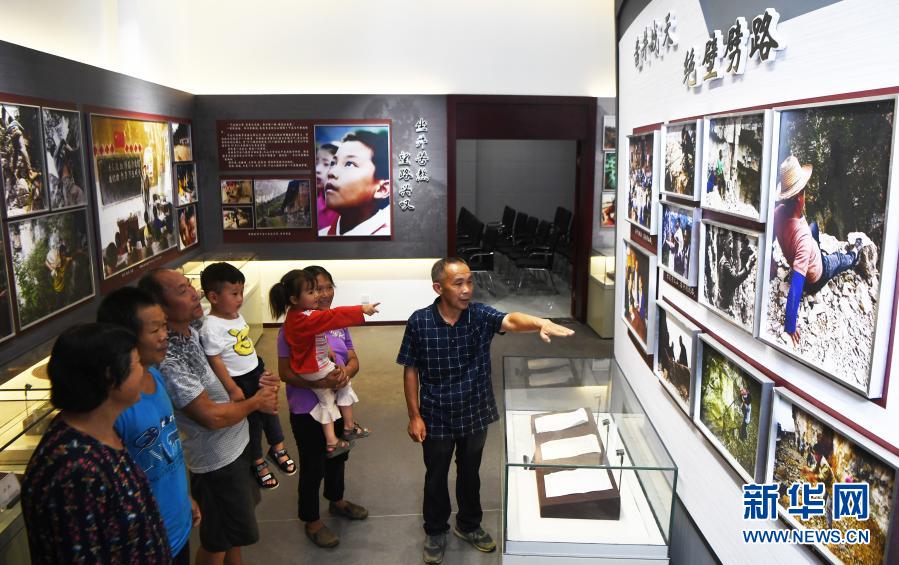 毛相林(右一)在下莊精神陳列館內講述當年修路的故事(2020年7月3日攝)。
