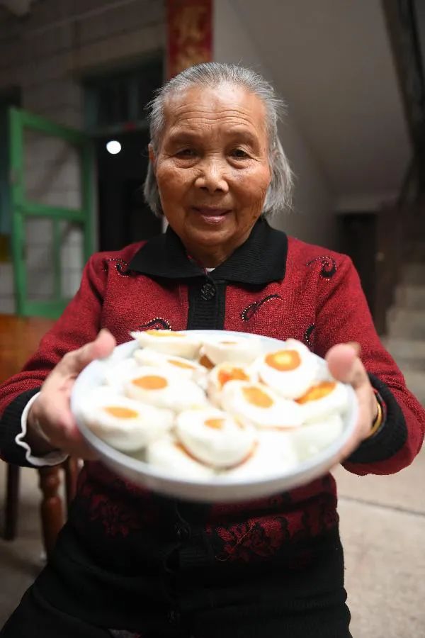 全國脫貧攻堅(jiān)獎奮進(jìn)獎獲得者廖秀英老奶奶在贛州瑞金市葉坪鄉(xiāng)鳳崗村家中向游客展示咸鴨蛋 劉青 攝