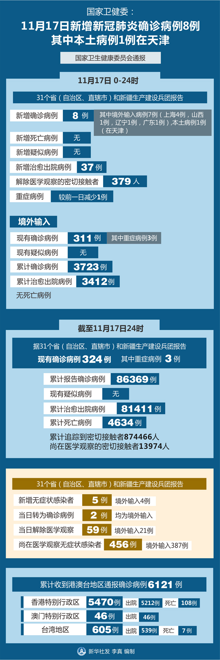 截至11月17日24時,據(jù)31個省(自治區(qū)、直轄市)和新疆生產(chǎn)建設(shè)兵團報告,現(xiàn)有確診病例324例(其中重癥病例3例),累計治愈出院病例81411例,累計死亡病例4634例,累計報告確診病例86369例,無現(xiàn)有疑似病例。累計追蹤到密切接觸者874466人,尚在醫(yī)學(xué)觀察的密切接觸者13974人。