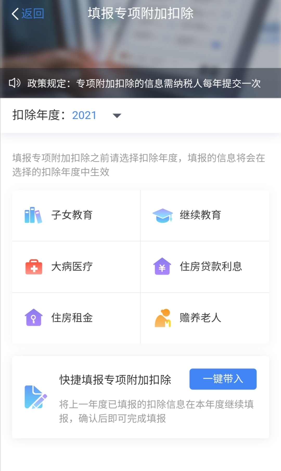 如何確認(rèn)?納稅人從APP首頁進(jìn)入“填報專項附加扣除”頁面后,既可以選擇一鍵帶入,即將上一年度已填報的扣除信息在本年度繼續(xù)填報,確認(rèn)后即可完成填報,也可以按目前自身實際情況逐項填報。若未及時確認(rèn),那么已填報的扣除信息將自動視同有效并延長至2021年。