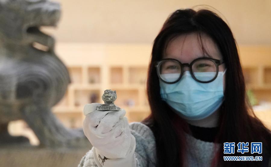 工作人員展示從“考古盲盒”中挖出的虎首印章文創(chuàng)產(chǎn)品(12月8日攝)。新華社記者 袁月明 攝