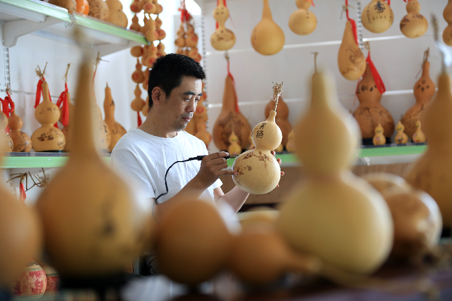 ????河北省邢臺市平鄉(xiāng)縣霍建龍,2014年因一起意外事故導(dǎo)致高位截癱。身殘志堅的他學習烙畫葫蘆藝術(shù),實現(xiàn)脫貧致富,并創(chuàng)辦了殘疾人烙畫葫蘆社,帶領(lǐng)其他殘疾貧困群眾脫貧致富。圖為霍建龍整理葫蘆作品。 柴更利 攝