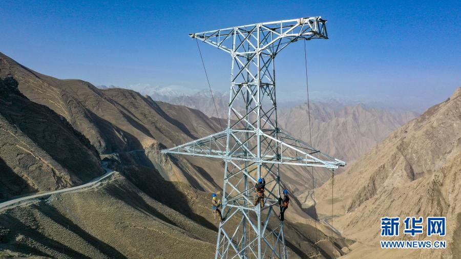 2020年4月28日,在新疆葉城縣南部山區(qū)海拔3100多米的阿卡孜達(dá)坂上,工人登上鐵塔檢修零部件,為放線做準(zhǔn)備(無人機(jī)照片)。