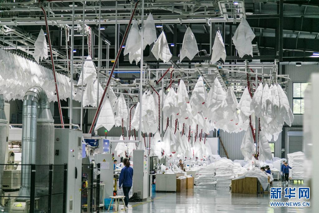 這是2019年4月28日在湖南省長沙市拍攝的夢潔家紡智能生產(chǎn)線。新華社記者 陳思汗 攝
