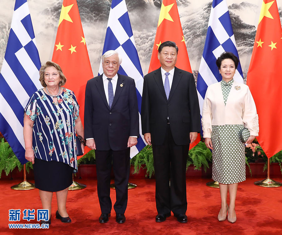 5月14日,國(guó)家主席習(xí)近平在北京人民大會(huì)堂同希臘總統(tǒng)帕夫洛普洛斯舉行會(huì)談。這是習(xí)近平和夫人彭麗媛同帕夫洛普洛斯夫婦合影。 新華社記者 鞠鵬 攝