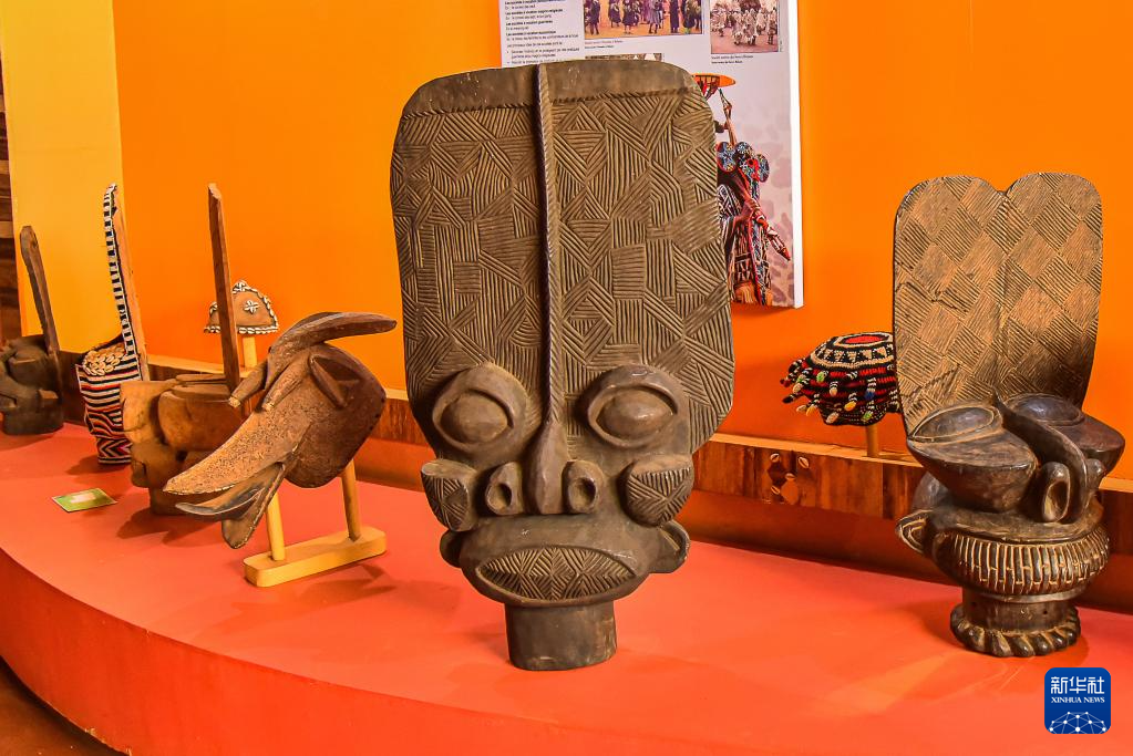 这是在喀麦隆姜村拍摄的喀麦隆文明博物馆展出的面具(4月10日摄)。