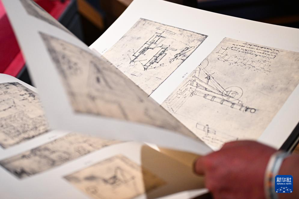 这是6月5日在展览上拍摄的数字复原后的达·芬奇手稿《大西洋古抄本》。