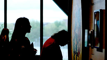 4月15日,在英国首都伦敦,一名女子在维多利亚与阿尔伯特博物馆东馆媒体日活动上观看影片。